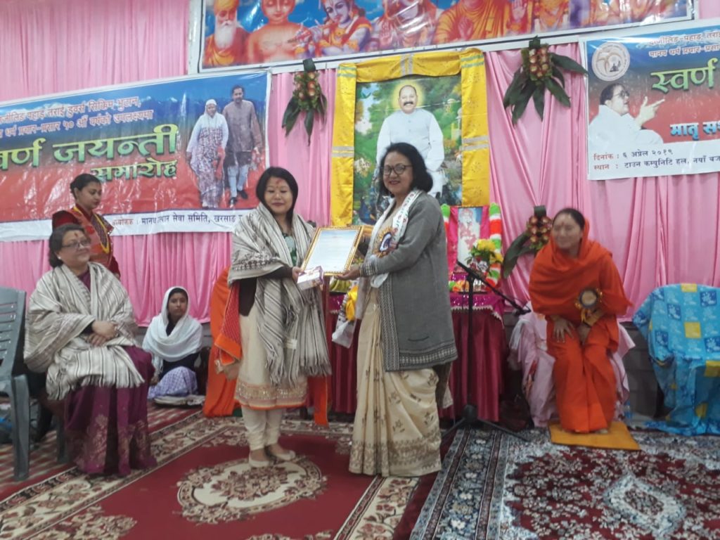 दुसरी चरण में हाल ही में विद्यावारिधि (डक्टरेट) की उपाधि से विभुषित हुए रितु राई, नेपाली संगीत जगत की लब्धप्रतिष्ठ गायिका हीरा रसाइली, कार्सियांग नगर में ईस्वी १९७० में महात्मा तेजानन्दजी से दीक्षित हुए निर्मला प्रधान जो सर्व प्रथम गुरु भक्त प्रेमी है और वरिष्ठ नागरिक बी० बी० गुरुङ को समिति के तरफ से सम्बर्द्धित किया गया । सत्संग की अगली क्रम में श्री माताजी ने समाज के प्रति दिए हुए योगदान के विशद रुप में चर्चा करते हुए सह प्रभारी महात्मा मनोहरी बाईजी ने सत्संग में कहा हम श्री माताजी को प्यार-दुलार, परामर्श सहयोग की कभी भूल नहीं सकते । भक्तजन संसार के कर्म करते हुए भजन भक्ति भी कर सकते हैं । असली सुख, शान्ति और आनन्द भगवान कि भजन भक्ति में ही है । प्रभारी सन्त महात्मा देवा बाईजी ने भी माताजी की परिचय देते हुए आत्माज्ञान की अनिवार्य और महत्ता विषयो पर चर्चा किया ।