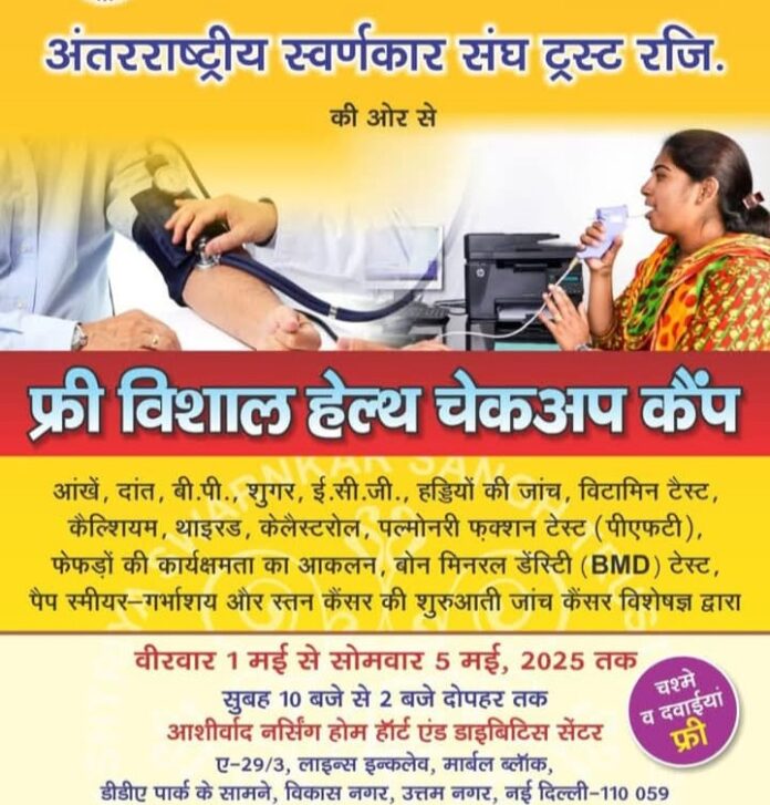 आपको बता दें कि निःशुल्क जांच उत्तम नगर स्थित तारीख o1मई से लगातार 5 मई 2025 तक आशीर्वाद नर्सिंग होम, A,29, 3 रिलायंस एनक्लेव विकास नगर, उत्तम नगर, नई दिल्ली स्थित, सेवा रूप में निःशुल्क जांच जारी है। इस जांच में लगभग हजारों स्थानीय लोगों ने जांच करा लाभ उठाया। यह निःशुल्क जांच, अंतर्राष्ट्रीय स्वर्णकार संघ के प्रधान,रा. हंसराज सोमनाथ आष्टा, महासचिव गुलशन कुमार तथा निवेदन करता आशीर्वाद हॉस्पिटल के संस्थापक डॉo प्रमोद सिंह तोमर व जरूरतमंद परिवार के लोगों की सेवा रूप सेवा करने वाले, विनोद सहगल के अथक प्रयासों से माता-बहनों व भाइयों, बुजुर्गों को इसका लाभ मिल रहा है। कैंप में जरूरतमंदों को चश्मा, दवाइयां इत्यादि दी जा रही हैं। अंतर्राष्ट्रीय स्वर्णकार संघ के अध्यक्ष और रा.हंसराज सोमनाथ आष्टा ने पत्रकार को बताया कि जब तक मां का आशीर्वाद रहेगा मैं अपने सहयोगियों के साथ मिलकर जरूरतमंदों की सेवा करता ही रहूंगा। आज भी मां के आशीर्वाद से सेवा कर रहा हूं।