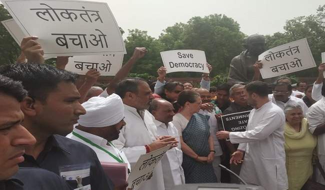 संसद परिसर में महात्मा गांधी की मूर्ति के सामने हो रहे इस विरोध प्रदर्शन में में कांग्रेस ने आरोप लगाया कि भाजपा विधायकों की खरीद फरोख्त कर कर्नाटक सरकार गिराना चाहती है। इस दौरान राहुल गांधी ने कहा कि हम कर्नाटक और गोवा के मुद्दे पर विरोध कर रहे हैं। बता दें कि कर्नाटक के कांग्रेस विधायकों के के बाद गोवा में कांग्रेस के 15 में से 10 विधायकों ने कांग्रेस से इस्तीफा दे दिया है। जिसके बाद इनके भाजपा में शामिल होने की खबरें लगातार आ रही हैं।