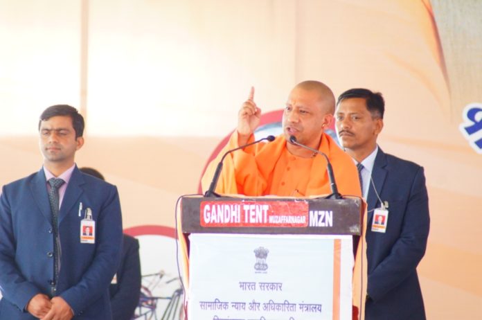 मुख्यमंत्री ने कार्यक्रम के आयोजन हेतु भारत सरकार के सामाजिक न्याय एवं अधिकारिता मंत्रालय के प्रति आभार व्यक्त करते हुए 3319 सहायक उपकरणों से लाभान्वित होने वाले सभी 2211 दिव्यांगजनों को बधाई दी। वितरित सहायक उपकरणों में ट्राईसाइकिल, व्हील चेयर, दृष्टि बाधितों के लिए स्मार्ट केन, डेजी प्लेयर, टैबलेट तथा श्रवणबाधितों के लिए कान की डिजिटल मशीन और कुष्ठ रोग से प्रभावित व्यक्तियों के दिनचर्या में सहायक एडीएल किट, मोबाइल फोन आदि शामिल हैं। योगी ने कहा कि इन सहायक उपकरणों के माध्यम से दिव्यांगजन का जीवन पहले से बेहतर, सरल और सहज होगा। वे समाज की मुख्यधारा में शामिल होकर राष्ट्र निर्माण में अपना योगदान कर सकेंगे। उन्होंने दिव्यांगजन को प्रोत्साहित करते हुए कहा कि ईश्वर प्रदत्त कठिनाइयों को चुनौती के रूप में स्वीकार करते हुए वे अपनी प्रतिभा एवं संकल्प के बल पर समाज में अपने कार्यों से प्रेरक बनें। दिव्यांगता मनुष्य के लिए एक प्रकार की परीक्षा है, परन्तु दिव्यांगजन इसे स्वीकार कर अपनी प्रतिभा से विभिन्न क्षेत्रों में नये कीर्तिमान स्थापित कर रहे हैं। इसके लिए दिव्यांगजन प्रोत्साहन के हकदार हैं। समाज की संवेदना इनके साथ होनी चाहिए। उन्होंने कहा कि हर व्यक्ति में विशिष्ट प्रतिभा होती है, जिसे प्रोत्साहित किए जाने पर वह समाज व राष्ट्र के लिए उपयोगी साबित हो सकती है।