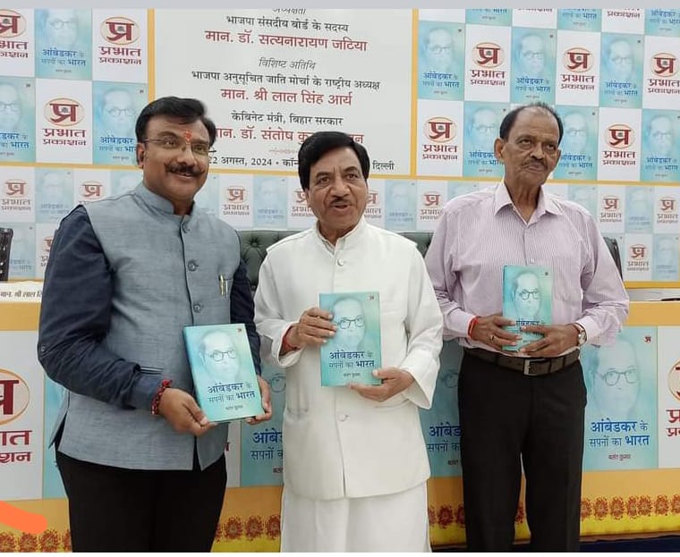 उपदेश सूर्यवंशी/नई दिल्ली, 23 अगस्त। कांस्टिट्यूशन क्लब में भारत सरकार के पूर्व मंत्री, संसदीय बोर्ड के सदस्य डॉ. सत्य नारायण जटिया व भाजपा के राष्ट्रीय संगठक श्री प्रशांत अरोड़ा ने प्रसिद्ध राष्ट्रवादी लेखक बसंत कुमार द्वारा लिखित व प्रभात प्रकाशन द्वारा प्रकाशित पुस्तक ‘आंबेडकर के सपनों का भारत’ का लोकार्पण किया।