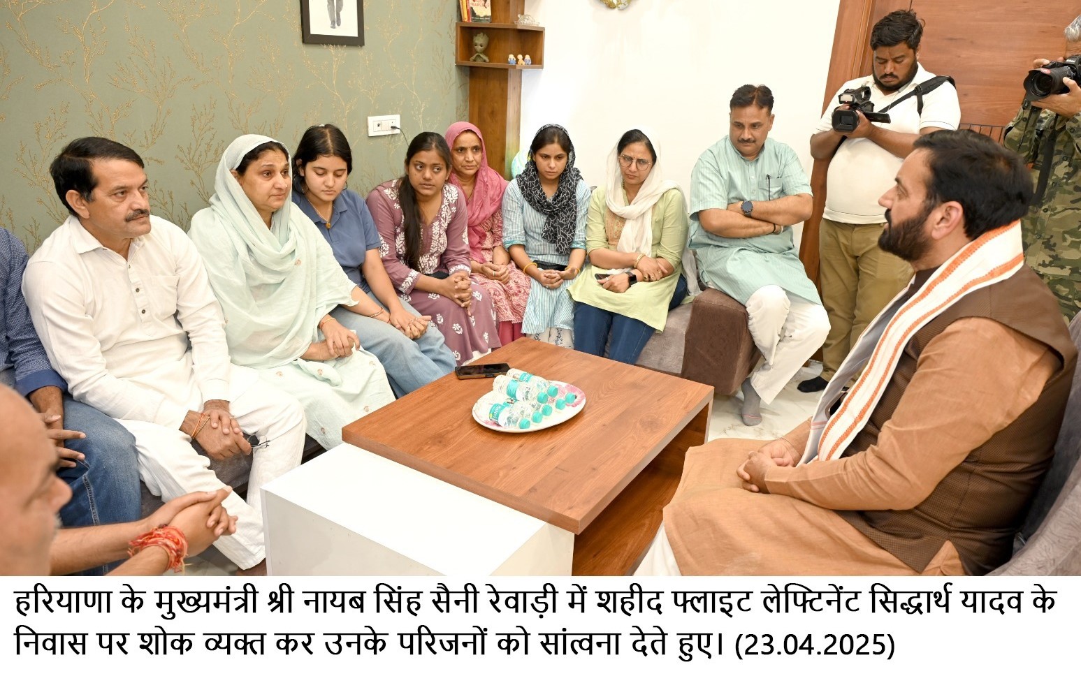हरियाणा के मुख्यमंत्री श्री नायब सिंह सैनी ने रेवाड़ी सेक्टर-18 स्थित फ्लाइट लेफ्टिनेंट सिद्धार्थ यादव के निवास पहुंचकर उनके बलिदान पर शोक व्यक्त किया। मुख्यमंत्री ने दिवंगत आत्मा की शांति हेतु ईश्वर से प्रार्थना की और शोक संतप्त परिजनों को ढांढस बंधाते हुए हरियाणा सरकार की ओर से हर संभव सहयोग दिए जाने का आश्वाशन दिया।