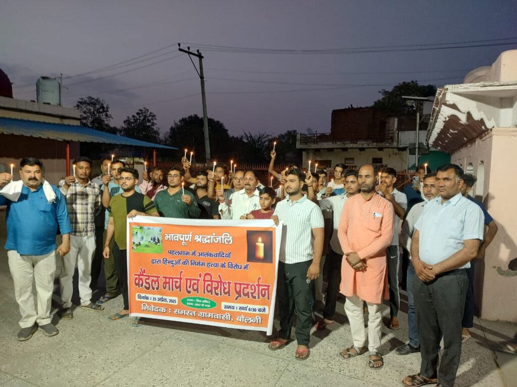 कश्मीर के अनंतनाग जिले के पहलगाम से 6 किमी दूर स्थित पर्यटन स्थल बैसरन घाटी में हुई इस्लामिक आतंकी घटना को लेकर लोगो मे भारी रोष है। इसके चलते गढ़ी बोलनी गांव के युवाओं ने गांव की गलियों में कैंडल मार्च निकालकर पाकिस्तान के खिलाफ रोष प्रदर्शन करते हुऐ पाकिस्तान मुर्दाबाद, इस्लामिक आतंक मुर्दाबाद के नारे भी लगाए। विश्व हिन्दू परिषद की जिला मंत्री राजकुमार यादव की इस कार्यक्रम में बतौर मुख्य वक्ता विशेष उपस्तिथि रही। यादव ने कहा की आतंकियों ने अनंतनाग जिले के पहलगाम में खुलेआम नरसंहार किया है। जिन वादियों में देशभर से सैलानी घूमने पहुंचे थे, उसी वादी में दहशतगर्दों ने एक-दो नहीं, बल्कि 28 सैलानियों को केवल धर्म के आधार पर चुन-चुन कर मारा। इस आतंकवादी हमले में 27 लोगों की मौत हो गई। 20 से ज्यादा लोग घायल हैं। हमला उस वक्त किया गया, जब बैसरन घाटी में बड़ी तादाद में पर्यटक मौजूद थे। कार्यक्रम में उपस्थित सभी ने इस हमले की कड़ी निंदा की है व सभी हिन्दुओ को एकजुट रहने का आवाहन भी किया है।